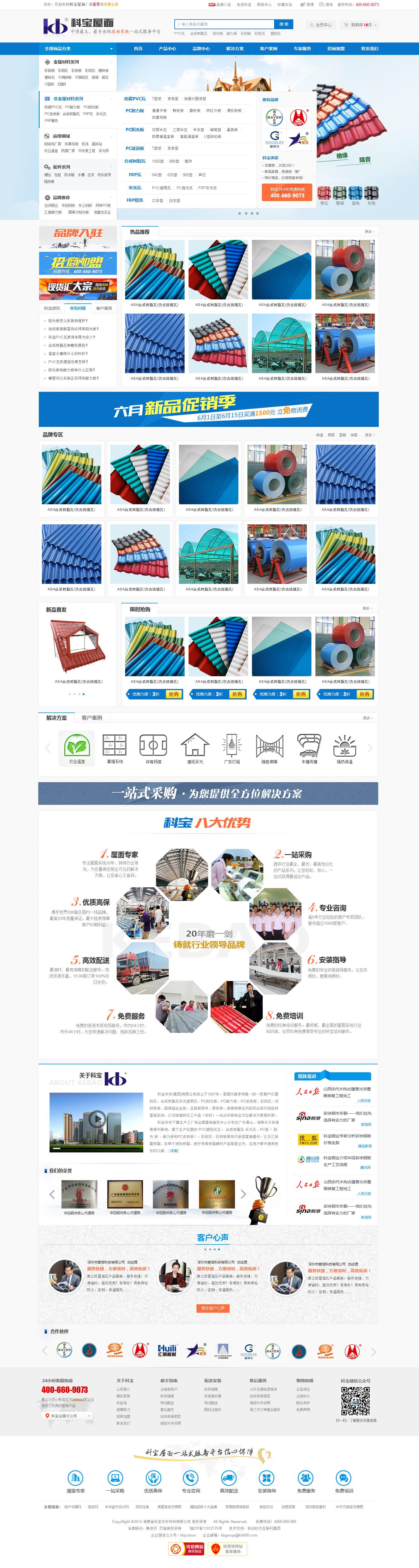 湖南省科宝华宇材料有限公司成立于1997年,总部位于星城长沙,是中国首家、也是唯一一家集PVC瓦、合成树脂瓦、PC阳光板、耐力板和波浪板、彩钢卷板、铝镁锰合金板材等现代钢结构屋面系统材料以及玻璃钢化工材料一站式采购和全方位解决方案提供商为一体的大型民营企业。